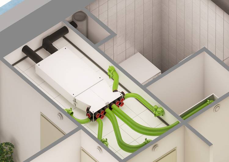 Die Luft wird mit den Hygiene+ Komponenten des UniAir-Verteilsystems von Wolf hygienisch durch das Haus geleitet.