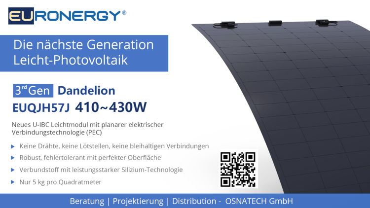 Euronergy hat mit den Modulen der Dandelion Serie das Potenzial, den Markt der Leicht-Photovoltaik zu revolutionieren. Leicht, robust, leistungsstark, ohne Verwendung von Blei und perfekt in der Optik – und einfach zu montieren. Das Euronergy Dandelion FullBlack-Leichtmodul der nächsten Generation mit nur 5kg/m² Gewicht und 420 Watt Leistung ist die Lösung für Dächer und Fassaden, bei denen es auf jedes Kilogramm ankommt.