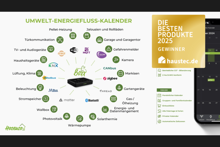 Die Hsen®Boxx ist Teil des Smart Building+ Konzepts und kombiniert intelligente Energieoptimierung, Gerätevernetzung und vorausschauende Steuerung in einem einzigen System. Verbrauch, Erzeugung und Speicherung lassen sich in Echtzeit überwachen, während der Umwelt-Energiefluss-Kalender Wetterdaten, Verbrauchsprofile sowie Urlaube oder Termine berücksichtigt.