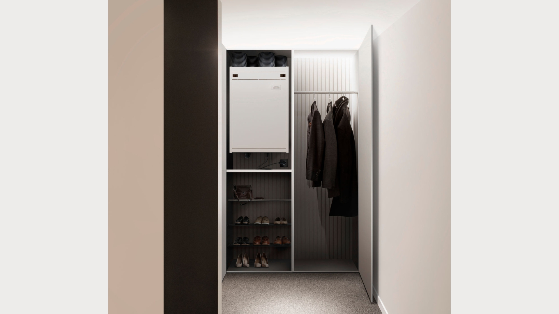 Das Kompaktgerät sorgt für eine zentrale Belüftung von Wohnflächen mit bis zu 160 m². Dabei erfüllt es in der Dimension H80 x B55 x T30 cm gängige Schrankmaße und ist beispielsweise für den Einbau in Küchen- oder Dielenschränken geeignet. Möglich ist auch die freie Wandmontage. Durch die tauschbaren Anschlüsse gestaltet sich die Installation flexibel – über einen Gerätetyp.