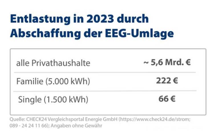 - Im Koalitionsvertrag der Ampel-Parteien ist eine komplette Abschaffung der EEG-Umlage zum 1. Januar 2023 verabredet. Ein Musterhaushalt (5.000 kWh) würde dann um weitere 222 Euro jährlich entlastet werden. Für alle Privathaushalte bedeutete die Abschaffung eine Entlastung von 5,6 Mrd. Euro im Vergleich zu 2022.