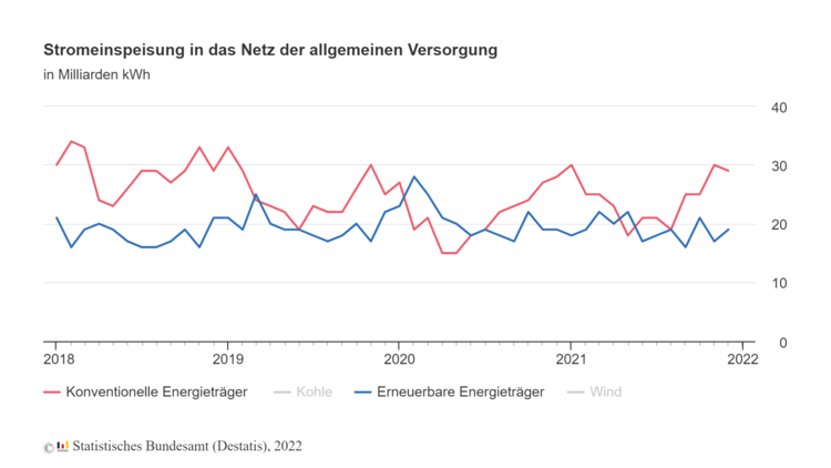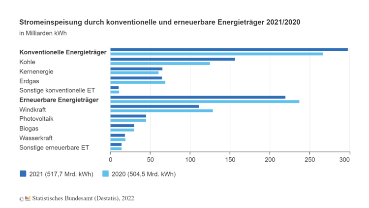 Die Einspeisung aus erneuerbaren Energien sank dagegen um 7,6 % auf einen Anteil von 42,4 % (2020: 47,1 %). Insgesamt wurden 2021 knapp 518 Milliarden Kilowattstunden Strom ins Netz eingespeist. Das waren 2,6 % mehr Strom als im Vorjahr, aber 3,1 % weniger als im von der Corona-Krise unbeeinflussten Jahr 2019.