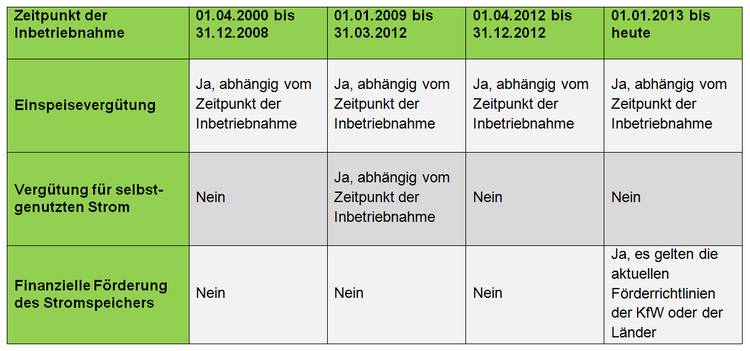 Nur wer seine Anlage vor dem 1.1.2009 installiert hat, erhält weder eine Eigenverbrauchsvergütung, noch eine Speicherförderung. Betreiber solcher Photovoltaikanlagen müssen noch bis zum Auslaufen ihres Stromliefervertrages mit dem regionalen Netzbetreiber warten und können erst dann den eigenen Strom verbrauchen und die Vorteile eines Stromspeichers nutzen.