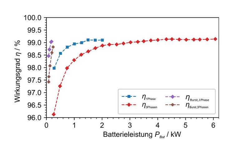 Für sehr geringe Leistungen wird zusätzlich ein entsprechender Betriebsmodus mit variabler Schaltfrequenz zur Ansteuerung mit möglichst geringen Schaltverlusten (Lückgrenzbetrieb) und ein pulsierender Betrieb (Burst-Modus) mit nur einer Phase aktiviert, bei dem der Wandler nur 10 Prozent der Zeit aktiv ist. "Dadurch kann der Teillastwirkungsgrad erheblich gesteigert werden, da damit die Ansteuer- und Leerlaufverluste reduziert werden können, die den Wirkungsgrad im Teillastbereich stark beeinflussen", erklärt Cornelius Armbruster, Projektleiter am Fraunhofer ISE.