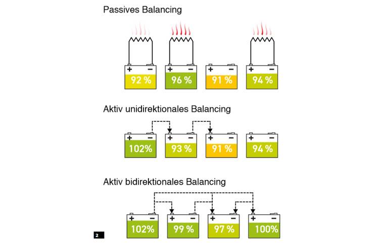 Sitzt die schwächste Zelle am Anfang der Reihe oder in einem anderen Batterieblock, gerät das System aber schnell an seine Grenzen. Am besten ist das bereits genannte aktive, bidirektionale Balancing, bei dem jede Zelle eine beliebige andere Zelle laden kann. Besonders innovative Systeme arbeiten dabei mit einem Ladestrom von bis zu fünf Ampere, denn hier werden die Zellladestände permanent und sekundenschnell während des laufenden Betriebes ausgeglichen. Aus diesem Grund kann der ganze Energieinhalt der Batterie auch verwendet werden und zeichnet sich im Vergleich zu einfacheren Systemen durch einen Performancezuwachs aus, der deutlich über die Differenz der Wirkungsgrade hinausgeht.