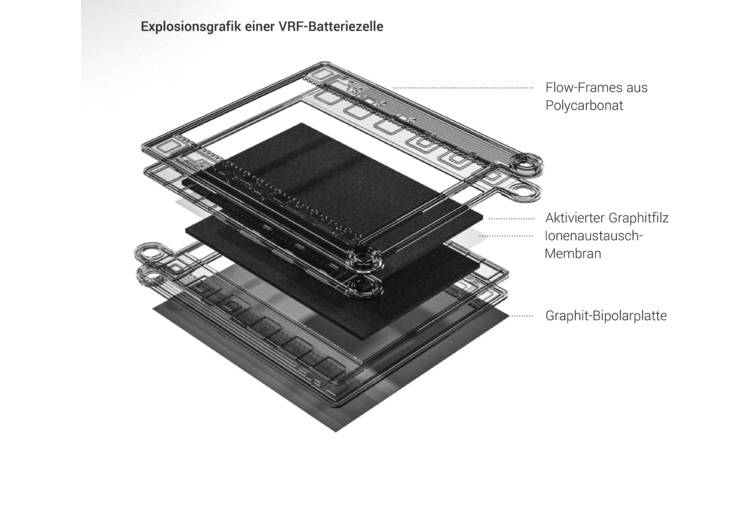 Der Vanadium-Elektrolyt fließt in zwei getrennten Kreisläufen mit unterschiedlichen Oxidationsstufen durch Batteriezellen, die aus zwei Halbzellen bestehen. Mehrere Batteriezellen aufeinander geschichtet bilden dabei den Batteriestack. Sobald dem Stack elektrische Energie zugeführt wird, kommt es in den Batteriezellen zu zwei Umwandlungsprozessen: Durch die Wanderung frei werdender Elektronen und positiver Ausgleichsionen zwischen den Halbzellen erfolgt in der negativen Halbzelle eine Reduktion und in der positiven Halbzelle eine Oxidation des Elektrolyts.