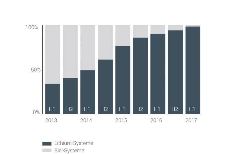 98% aller Heimspeichersysteme, die 2017 installiert wurden, basieren auf der Lithium-Ionen-Technologie. Noch vor vier Jahren teilten sich lithium- und bleibasierte Systeme den Heimspeichermarkt. Aufgrund der geringeren Lebensdauer und höheren Selbstentladung konnten sich Bleispeicher nicht gegen Lithiumsysteme durchsetzen.