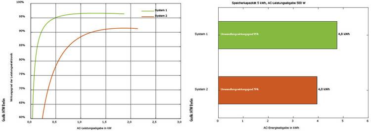 Der Umwandlungswirkungsgrad der Leistungselektronik kann in diesem Leistungsbereich je nach System sehr unterschiedlich ausfallen. Auf Effizienz getrimmte Systeme erreichen bei einer AC-Leistungsabgabe von 500 Watt Spitzenwirkungsgrade von bis zu 95 Prozent. Schluckspechte kommen dagegen nur auf Umwandlungswirkungsgrade unter 80 Prozent. Da die Umwandlungsverluste als Abwärme verpuffen, tragen insbesondere ineffiziente Speichersysteme ungewollt zur Gebäudeheizung bei.