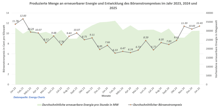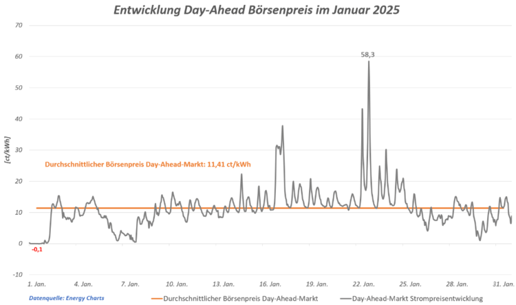 Die Börsenstrompreise lagen im Januar durchschnittlich bei 11,41 Cent pro Kilowattstunde im Day-Ahead-Markt der Handelsbörse. Strom ist damit an der Börse weiterhin günstig. Insbesondere lagen die Strompreise 14 Stunden lang unter null; das ist eine gute Nachricht für Verbraucher mit dynamischen Stromtarifen. Denn diese Tarife geben die Echtzeit-Strompreise der Handelsbörse plus Steuern und Abgaben weiter. Seit dem 1. Januar 2025 sind Stromanbieter verpflichtet, solche dynamischen Stromtarife anzubieten.