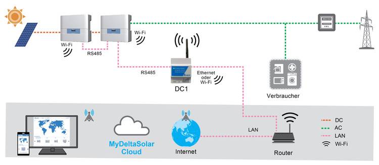 Bei der Installation kann auf Kabel verzichtet werden, was die Inbetriebnahme besonders einfach gestaltet. Die Verbindung über RS485-Schnittstellen oder Wi-Fi zu den Delta-Wechselrichtern erfolgt über den neuen Datenkollektor DC1.