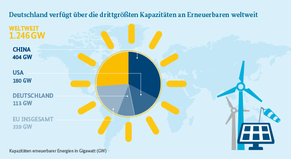 Die im Flächenvergleich riesigen USA verfügen dagegen über 180 GW Kapazitäten an erneuerbaren Energien, wovon ebenfalls ein großer Teil durch Windkraft (96 GW) und Solarenergie (62 GW) gedeckt wird. Der Flächengigant China kann auf insgesamt 404 GW erneuerbare Kapazitäten zurückgreifen. Alle 28 EU-Staaten zusammen verfügen über immerhin 339 GW an Erneuerbaren-Kapazitäten, weltweit sind es insgesamt 1.246 GW. (Erneuerbare Energie aus Wasserkraft wurde bei den Berechnungen nicht berücksichtigt.)