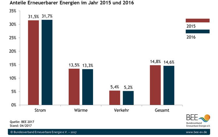 „Während 23 EU-Mitgliedsstaaten ihre Ziele beim Ausbau Erneuerbarer Energie erreichen oder sogar übertreffen, gehört Deutschland zu den wenigen Staaten, die das Ziel verfehlen, wenn die Politik nicht rasch reagiert“, kommentiert Harald Uphoff, kommissarischer BEE-Geschäftsführer. „Anstatt die Energiewende nach dem Klimavertrag von Paris zu beschleunigen, wurde der Ausbau Erneuerbarer Energien im Strombereich kräftig gedrosselt und der jahrelange Stillstand bei der Wärme- und Verkehrswende nur verwaltet. Das hat 2016 dazu geführt, dass der Anteil Erneuerbarer Energien sogar leicht rückläufig war. Der Zuwachs im Stromsektor konnte den Rückgang bei Wärme und Verkehr nicht kompensieren“, so Uphoff.
