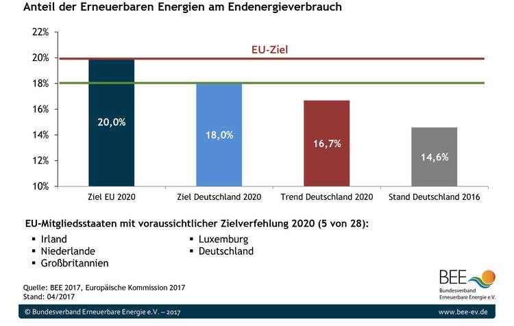 Trotz des Zuwachses der Erneuerbare Energien am Bruttostromverbrauch im ersten Quartal 2017 (siehe unten) wird das Erneuerbare Energien-Ziel für 2020 laut einer aktuelle Trend-Prognose des Bundesverbands Erneuerbare Energie e.V. (BEE) nicht erreicht. Demnach wird der Anteil Erneuerbarer Energien von derzeit 14,6 Prozent am gesamten Endenergieverbrauch bei Fortsetzung des jetzigen Ausbautempos bei lediglich 16,7 Prozent liegen. Verbindliches EU-Ziel ist jedoch ein Anteil von 18 Prozent am gesamten Endenergieverbrauch im Jahr 2020.