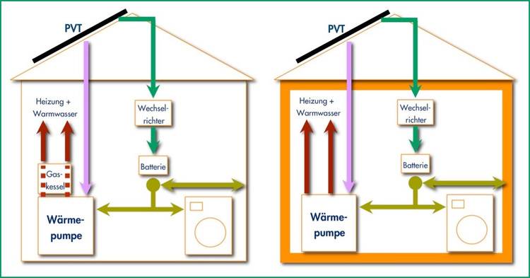 Alternativ zu einer Solarthermieanlage kann eine Wärmepumpe in Kombination mit einer PVT-Anlage installiert werden, mit der ca. 80 % des Wärmebedarfs gedeckt wird, während der vorhandene Heizkessel weiter genutzt wird, um Leistungs- und Temperaturspitzen abzudecken. Die Auslegung der PVT-Wärmepumpen-Kombination sollte so erfolgen, dass nach Wärmedämmmaßnahmen am Gebäude der verbleibende Energiebedarf durch die Wärmepumpe vollständig gedeckt werden kann [5] (Bild 3).