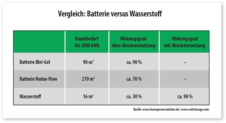 Dabei entsteht Abwärme, die für den Brauchwasserspeicher genutzt wird. Der Wasserstoff wiederum wird über eine Leitung in Stahlbehältern gesammelt, die in einem kleinen Häuschen im Garten stehen. Auf diese Weise lässt sich die Sonnenenergie über Monate hinweg speichern und schließlich in den dunklen Wintermonaten nutzen – eben dann, wenn die Nachbarhäuser ihren Strom aus dem Netz beziehen müssen, weil ihre mit PV-Modulen gepflasterten Dächer keine nennenswerten solaren Gewinne mehr erzielen können.