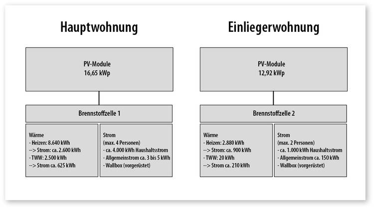 Reichen auch in Schulz’ Wasserstoffhaus die solaren Erträge an Wintertagen nicht aus, um genügend Strom und Wärme zu produzieren, wird Wasserstoff aus dem Speicher den beiden Brennstoffzellen zugeführt. Diese wandeln den Wasserstoff in Strom um. Diesen Strom nutzt die Wärmepumpe, und die dabei entstehende Abwärme wird zudem über die Lüftung fürs Heizen genutzt, was für den Wirkungsgrad des Anlagenkonzepts ausgesprochen förderlich ist.