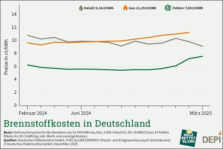 Der Preis für eine Kilowattstunde Wärme aus im März 2025 zum DEPI-Pelletpreis gekauften Pellets beträgt 7,60 Ct/kWh. Damit gibt es einen Preisvorteil zu einem aktuellen Heizöleinkauf von rund 17 % (Vergleichsbasis siehe Grafik).