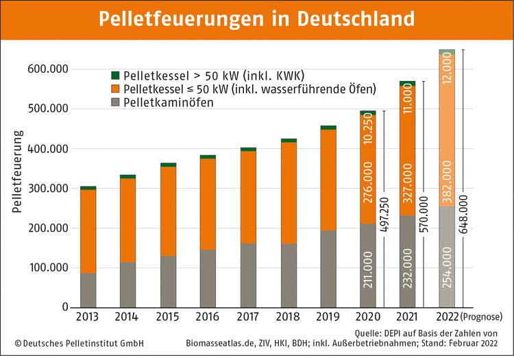 Die gestiegene Nachfrage ist aber auch auf sehr viele neue Pelletfeuerungen in Deutschland zurückzuführen, was von der staatlichen Förderung seit 2021 über die Bundesförderung für effiziente Gebäude (BEG) befeuert wurde. Laut Bundesverband der Deutschen Heizungsindustrie (BDH) verzeichneten die Wärmepumpen mit einem Plus von 25 Prozent sowie Biomasse-Kessel, hier insbesondere die Pelletheizung, mit einem Plus von 6 Prozent (gegenüber dem Vorjahr) den größten Zuwachs unter allen Heizsystemen im ersten Halbjahr dieses Jahres.