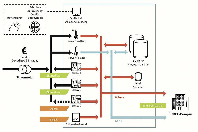 Als ein erstes Ergebnis konnten wir für den Euref-Campus in Berlin-Schöneberg zeigen, dass durch ein effizientes Zusammenspiel verschiedener Energiewandler und prognosebasierter Fahrweisen die Energieversorgung sogar heute schon klimaneutral und zu Preisen eines konventionellen Energiekonzeptes erfolgen kann.