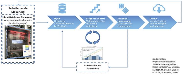 - die Hardwareintegration einer Steuerbox an den Anlagen, die bei gleichzeitiger Sicherstellung der Versorgungssicherheit die optimierten Fahrpläne für die Anlagensteuerung bereithält und diese immer im richtigen Moment ansteuert (Meeder et al. 2019a, 2019b).
