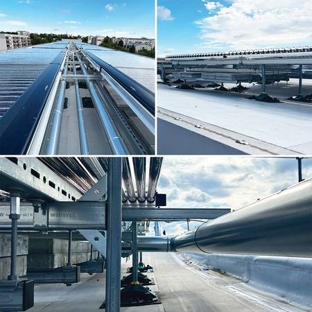Die bei Bedarf leicht erweiterbaren Komponenten des modular aufgebauten Systems sind zukunfts- und strapazierfähig: Das mit der Walraven-Systemtechnologie BIS UltraProtect 1000 beschichtete Schienensystem bietet erhöhten Korrosionsschutz, die Spritzgussteile sind gemäß ISO 16474-3:2014-02 witterungs- und UV-beständig und darüber hinaus aus recyceltem Material. Ohne Eingriff in die Gebäudesubstanz kann die Walraven-Lösung ohne Dachhautdurchdringung montiert, aber auch zurückgebaut werden. Andreas Strobel, Walraven-Projektverantwortlicher, beriet umfassend, sowohl vor Ort als auch in zahlreichen Vorgesprächen, während die Kollegen der Walraven-Anwendungstechnik mit technischen Auslegungen in Form von Zeichnungen, Stücklisten und statischen Vorbemessungen unterstützten.
