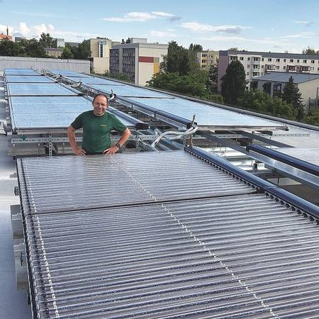 Bei der Aufständerung der thermischen Solaranlage mit Röhrenkollektoren und der durch das Gebäude vorgegebenen Dachneigung in der thüringischen Stadt zeigt das Flachdachinstallationssystem seine Stärken – abgerundet durch die technischen Lösungsvorschläge des Walraven-Projektleiters. Ein rundherum gelungenes Projekt, dem aufgrund der überzeugenden Umsetzung gleich ein ebenso gestaltetes folgt. Dazu sagt Andreas Strobel abschließend: „Die Installation der Solarthermie-Anlagen in Altenburg brachte einige komplexe Anforderungen mit sich. Einerseits musste die Dachneigung von sieben Grad ausgeglichen werden, andererseits stellte die maximale Höhe der Konstruktion eine besondere Herausforderung dar. Eine Art Dilemma. Aufgrund vorherrschender Windlastverhältnisse durfte der Montageunterbau nur unwesentlich über die Dachkante hinausragen, während darunter ausreichend Platz für notwendige Zusatzballastierungen geschaffen werden musste. Dazu galt es zu beachten, dass die präzise Platzierung der Konstruktion auf den tragenden Dachrippen erfolgt, um die strukturelle Integrität sicherzustellen und die Hohldielen nicht zu stark zu belasten. Ohne die enge Zusammenarbeit mit dem Statiker wäre die erfolgreiche Umsetzung des Projekts nicht möglich gewesen.“