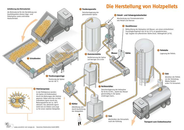 Dazu ein Beispiel: Ein relativ energieintensiver Schritt in der Abfolge der einzelnen Schritte in der Holzpellets-Produktion ist die Trocknung des Ausgangsmaterials Späne auf die richtige Prozessfeuchte. Dafür gibt es industrielle Trockner, zum Beispiel Band- oder Trommeltrockner. Diese können ganz unterschiedlich ihre Energie beziehen, zum Beispiel aus Abwärme einer am Werk angegliederten Stromproduktion. Dann wäre die Primärenergie in Gestalt einer Kraft-Wärme-Kopplung effizient genutzt. Zudem stellt sich die Frage, welcher Energieträger verwendet wird. Wird die Energie für die Trocknung der Späne aus erneuerbaren Energien bereitgestellt oder aus fossilen, zum Beispiel Öl oder Erdgas? Und woher stammt der Strom für die Produktion? Handelt es sich um Ökostrom oder Strom, der noch aus dem herkömmlichen Strommix besteht?
