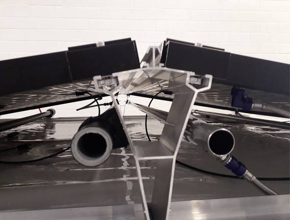 Kleinere Anlagen beispielsweise für Privatkunden werden über Edelstahlrohre hydraulisch eingebunden, größere Anlagen mit Rohren aus Kunststoff. Selbst in der kalten Jahreszeit liefert das System nennenswerte Temperaturen. Denn die Hydraulik nimmt die Temperatur unter den Solarmodulen an.
