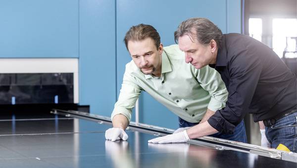 Besuch im neuen Werk der Firma Sunmaxx in Ottendorf-Okrilla bei Dresden. Im vorigen Jahr wurde die Fertigung aufgebaut, die kleine Fabrik kann bis zu 50 Megawatt PVT-Module im Jahr herstellen. Wer jetzt an klobige Kästen denkt – oben das Photovoltaiklaminat, darunter ein dicker Flachkollektor – wird enttäuscht. Denn der neue PVT-Kollektor ist absolute Hightech: schlank, smart und supereffizient.