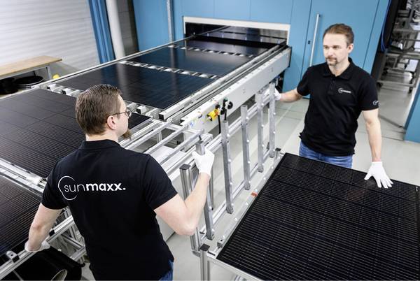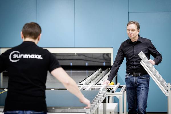 Hinter Sunmaxx PVT steht der Automobilzulieferer Mahle, der mehr als drei Millionen Euro in die neue Fabrik investiert hat. Aus der Linie läuft ein Solarmodul, das durch den ultradünnen und sehr leichten Wärmetauscher nur 3,5 Kilogramm schwerer ist als ein Standardmodul (22 Kilogramm). Das Laminat besteht aus 108 Halbzellen (M10), es wird komplett vorgefertigt angeliefert. Die Montage der Dosen erfolgt, nachdem der Wärmetauscher angeklebt wurde.