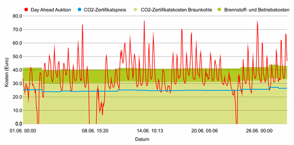 Höhere CO2-Zertifikatspreise gekoppelt mit niedrigen Day-Ahead Börsenstrompreisen und niedrigen Gaspreisen führen sehr schnell zu einem Brennstoffwechsel von Braunkohle zu Gas. Wenn die Kosten für die CO2-Zertifikate (in Euro pro Tonne CO2) auf dem Niveau des Börsenstrompreises (in Euro pro MWh) liegen, wird die Stromerzeugung aus Braunkohle unwirtschaftlich. Im Juni wurde ein Teil der Stromerzeugung von Braunkohle auf Gas umgestellt, was zu einer Reduktion der CO2-Emissionen um ein Drittel führte. Würde die komplette Braunkohle durch Gas ersetzt, so würden die Emissionen um zwei Drittel fallen.