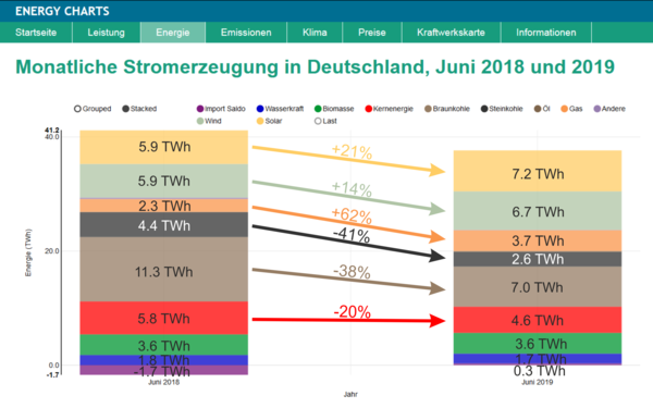 Der Export von 1,7 TWh in Juni 2018 wandelte sich zu einem Import von 0,3 TWh im Juni 2019. Die Last sank um 8,1% von 40,7 TWh im Juni 2018 auf 37,6 TWh im Juni 2019.