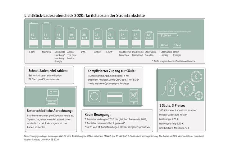 Unterwegs Strom zu laden bleibt auch 2020 für die Mehrzahl der E-Auto-Fahrer eine Zumutung: Die Tarife sind undurchsichtig. Es gibt eine Vielzahl an Abrechnungsverfahren. Und der Zugang zu den rund 30.000 öffentlichen Strom-Zapfsäulen in Deutschland ist kompliziert. Das geht aus dem vierten Ladesäulencheck des Klimaschutz-Unternehmens LichtBlick hervor.