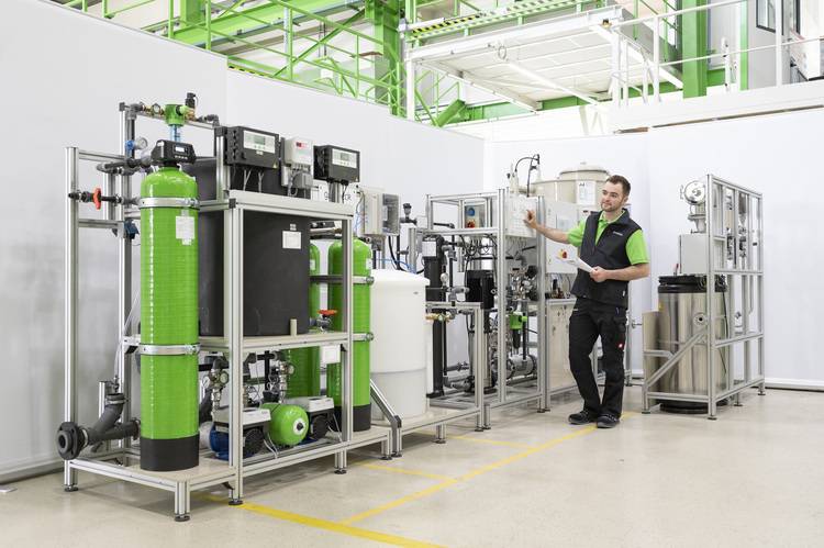 Um den Salzgehalt weiter zu senken, kann der Wasseraufbereitungsspezialist Grünbeck die Systeme zweistufig ausführen. Das Permeat durchfließt also eine zweite Umkehrosmose. In Anlagen für die Erzeugung von Wasser für Elektrolyseure kombiniert Grünbeck oft eine Umkehrosmoseanlage mit einer nachgeschalteten Elektrodeionisationsanlage. Diese Kombination erzeugt beim ersten Durchfließen Wasser mit Leitfähigkeiten < 0,2 µS/cm. Durch den Einsatz einer Ionenaustauscheranlage wird die Leitfähigkeit des Wassers im Elektrolysekreislauf konstant niedrig gehalten (< 0,1 µS/cm).