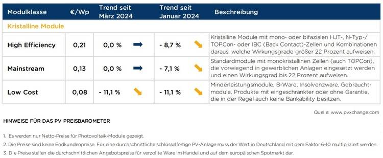 Die aktuell im Markt kursierenden Preise für PERC-Lagerware unter 2 Quadratmeter mit bis zu 410 Wattpeak knapp unter 10 Eurocent pro Watt wurden in diesem Monat dem Preispunkt ‚Low Cost‘ zugeordnet. Das ist im Wesentlichen der Grund für den erneuten Rückgang im Preisindex. Höhere Leistungsklassen, sowie Full Black- und Doppelglasmodule wurden weiterhin der ‚Mainstream‘ oder ‚High Efficiency‘-Gruppe zugeordnet, da sich diese Produkte auch mit geringerer Leistung noch einigermaßen gut verkaufen lassen. Nur Standardmodule um 400 Wattpeak entwickeln sich zunehmend zu Ladenhütern, die oft mit aller Gewalt abverkauft werden – eine Preisuntergrenze ist dort nicht absehbar.