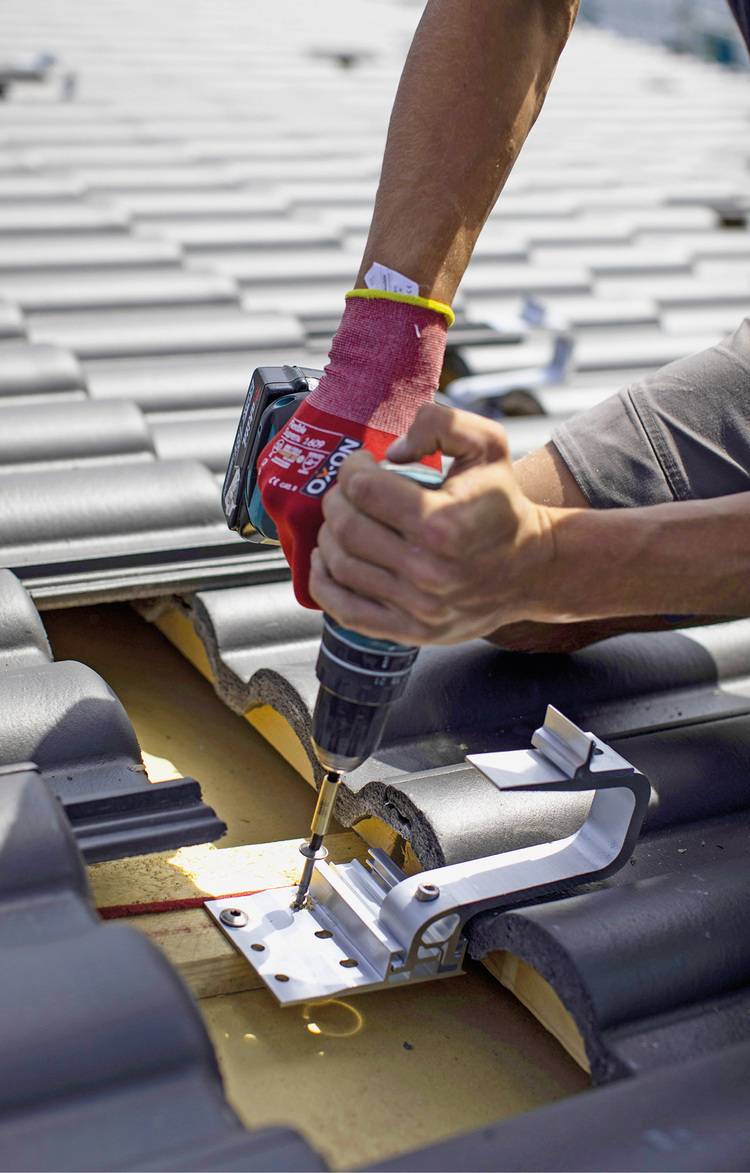 Dadurch spart sich der Handwerker das aufwendige und staubige Fräsen von Dachziegeln auf der Baustelle und kann die Anlage schneller montieren. Er schraubt dabei direkt auf die Lattung und die Konterlattung über der Dämmung. Den Blechersatzziegel hat IBC Solar in verschiedenen Formen und Farben im Portfolio, sodass er mit den gängigen Dachziegeln kombiniert werden kann.