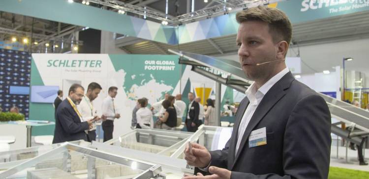Im Anschluss hat Christian Salzeder, Produktmanager für Freilandsysteme bei Schletter, die Neuheiten in seinem Bereich vorgestellt. Hier haben sich die Entwickler unter anderem auf die Anpassung des Trackersystems an die aktuelle Entwicklung auf dem Modulmarkt konzentriert. Denn der Tracker ist jetzt auf die Installation von größeren Modulen ausgelegt.