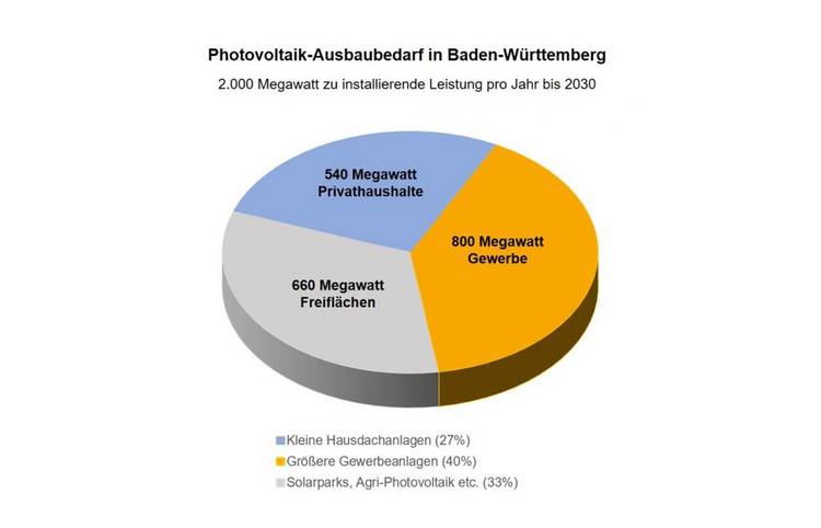 Eine Ende Oktober 2021 erschienene Studie der Plattform Erneuerbare Energien Baden-Württemberg ist beim Ausbaubedarf im Südwesten zu einem ähnlichen Ergebnis gekommen: Die installierte Leistung der auf Dächern, Fassaden und im Freiland installierten Photovoltaikmodule solle auf zwei Gigawatt pro Jahr wachsen. Bis 2040 brauche es eine Steigerung von heute sieben auf rund 39 Gigawatt.