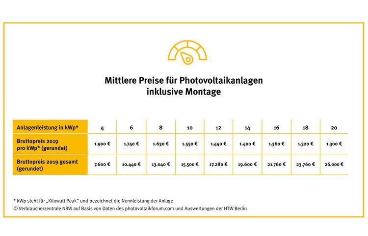 Eine unabhängige preisliche Orientierung für die Anschaffung bietet die Verbraucherzentrale NRW mit ihrem Preisindex unter www.verbraucherzentrale.nrw/photovoltaik-preise. „Private Betreiber müssen vor allem wissen, dass die nötige Investition nicht proportional mit der Anlagengröße wächst.
