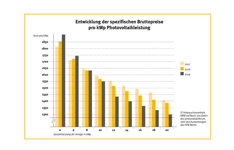 Die Auswertung von rund 2.100 Original-Angeboten aus dem Jahr 2019, welche die HTW Berlin im Auftrag der Verbraucherschützer durchgeführt hat, bestätigt Trends des Vorjahrs. Kleine Anlagen mit vier oder sechs Kilowatt Leistung stiegen erneut im Preis (+2,7 bzw. +1,2 Prozent), während größere Anlagen günstiger wurden.