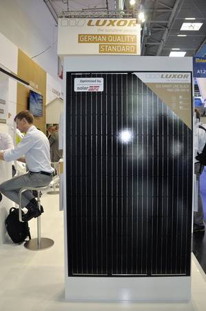 Hochleistung hat sich auch Luxor Solar aus Stuttgart auf die Fahnen geschrieben. Ein monokristallines Modul mit 60 Zellen und sieben Busbars wird demnächst verfügbar sein. 320 Watt Leistung verspricht es. Eine weitere Neuheit von Luxor ist das Eco Smart Line Full Black M60, das mit einem Solaredge-Optimierer geliefert wird. Auf seine Glas-Glas-Module der Secure Line in transparenter und Full-black-Optik bietet Luxor 35 Jahre Produktgarantie und eine lineare Leistungsgarantie mit 88,5% nach 35 Jahren.