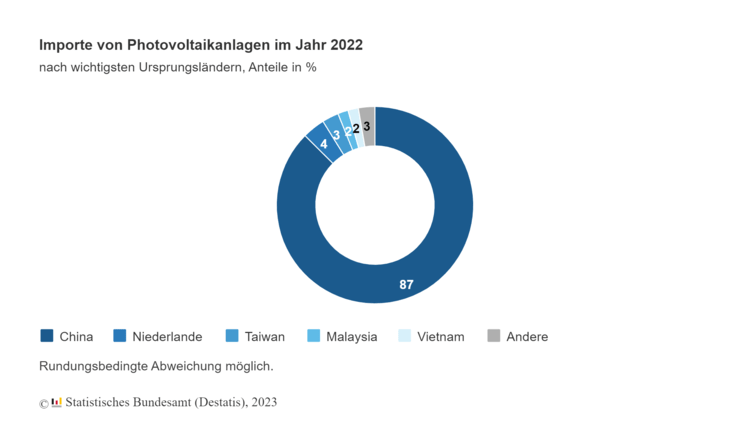 China ist das aus deutscher Sicht mit Abstand wichtigste Herkunftsland für Photovoltaikanlagen: Rund 87 % der nach Deutschland importierten Photovoltaikanlagen kamen im Jahr 2022 aus der Volksrepublik. Der Wert dieser eingeführten Anlagen betrug gut 3,1 Milliarden Euro, wie das Statistische Bundesamt (Destatis) mitteilt. Insgesamt wurden im vergangenen Jahr Photovoltaikanlagen im Wert von rund 3,6 Milliarden Euro nach Deutschland importiert. Auf China als wichtigster Lieferant von Solarzellen, Solarmodulen und Co. folgten mit großem Abstand die Niederlande (143 Millionen Euro oder 4 %) und Taiwan (94 Millionen Euro, 3 %).