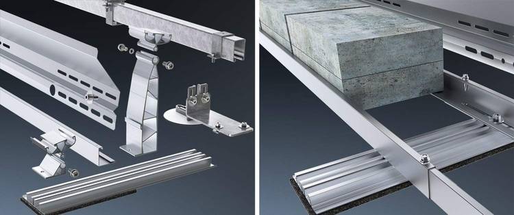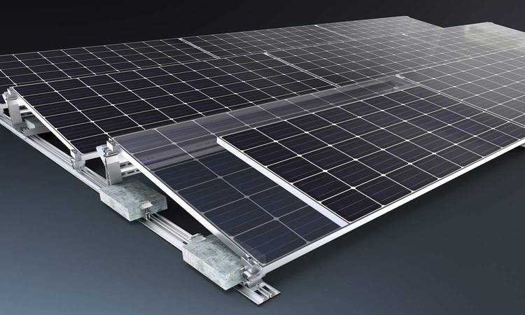 Die Schienenquerverbinder des Systems können gleichzeitig als Ballasträger eingesetzt werden. Da sich diese stufenlos auf die Modullänge einstellen lassen, ist eine Vormontage auch ohne Module schnell und einfach möglich. Eine vormontierte Fußwippe stellt sich stufenlos – je nach Modulbreite – auf den richtigen Winkel ein. Federelemente halten die Fußwippe in Position und erleichtern die Positionierung des PV-Moduls. Zwei Nuten ermöglichen eine Kurzseiten- und eine Langseiten-Klemmung und bieten Toleranzausgleich im Aufbau.