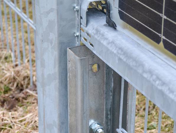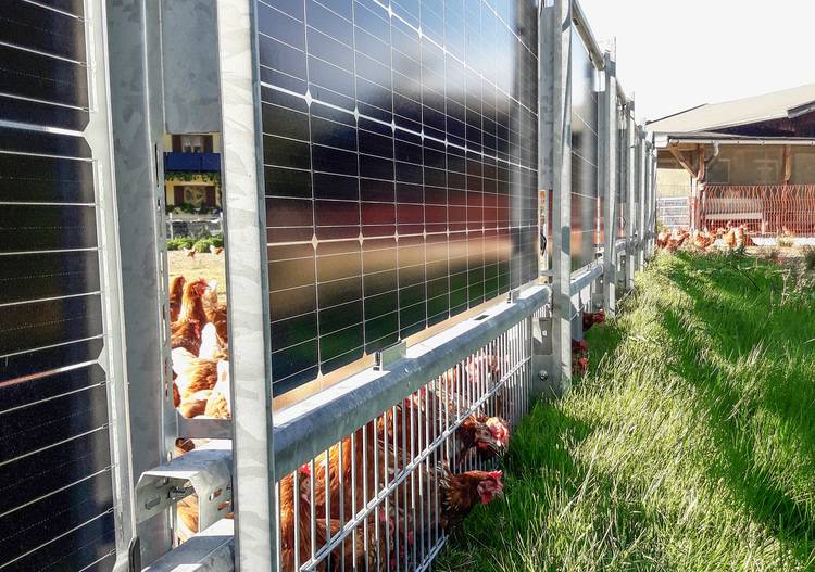 Um den Zaun zu installieren, rammen die Monteure von Elektrotechnik Leitinger Pfosten im Abstand einer Modullänge in den Boden. Die Rammtiefe hängt von den örtlichen Bodenverhältnissen und der Höhe der Anlage ab. Sie liegt zwischen 1,5 und zwei Metern. Leitinger baut seine Zäune mit einer Modulreihe, sodass die Gesamthöhe von 1,5 Metern nicht überschritten wird. „Denn bis zu dieser Höhe ist der Bau der Zäune in Österreich genehmigungsfrei“, erklärt Bernhard Stöckl. Er hat die Erfahrung gemacht, dass die Nachbarn tatsächlich nachmessen, ob der Zaun die erlaubte Höhe überschreitet. Zwar ist das Modul nur knapp einen Meter hoch. Doch unter den Modulen bleiben etwa 50 Zentimeter Platz, damit die unteren Zellreihen im Winter nicht so leicht einschneien. In St. Martin wurde die Lücke mit einer Doppelstabmatte ausgefüllt, sodass die Hühner nicht entlaufen können.