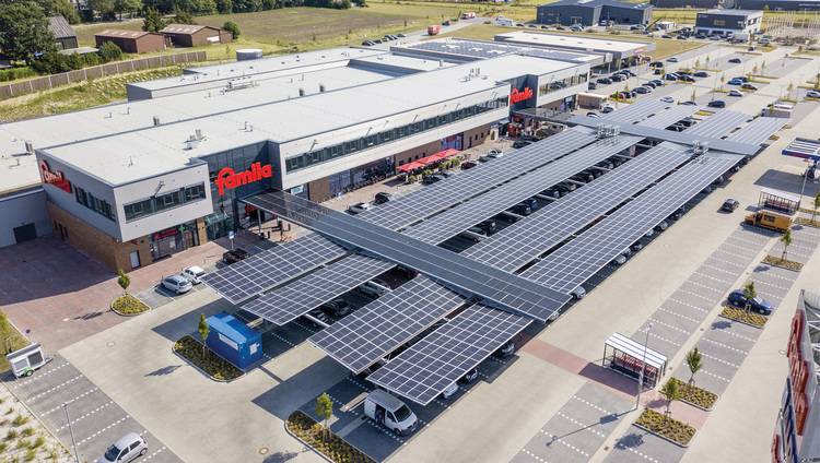 Bei der solaren Überdachung von Parkplätzen ist es wichtig, nicht nur die praktischen Aspekte in den Blick zu nehmen, sondern auch die Ästhetik. Das gilt vor allem dann, wenn es um Kundenparkplätze geht. Denn dann gelten zusätzliche Kriterien. Die Kunden wollen nicht durch düstere Gänge schleichen, sondern gut geschützt durch freundliche, offene Räume zum Eingang kommen. Wie so etwas aussehen kann, hat Famila gezeigt.