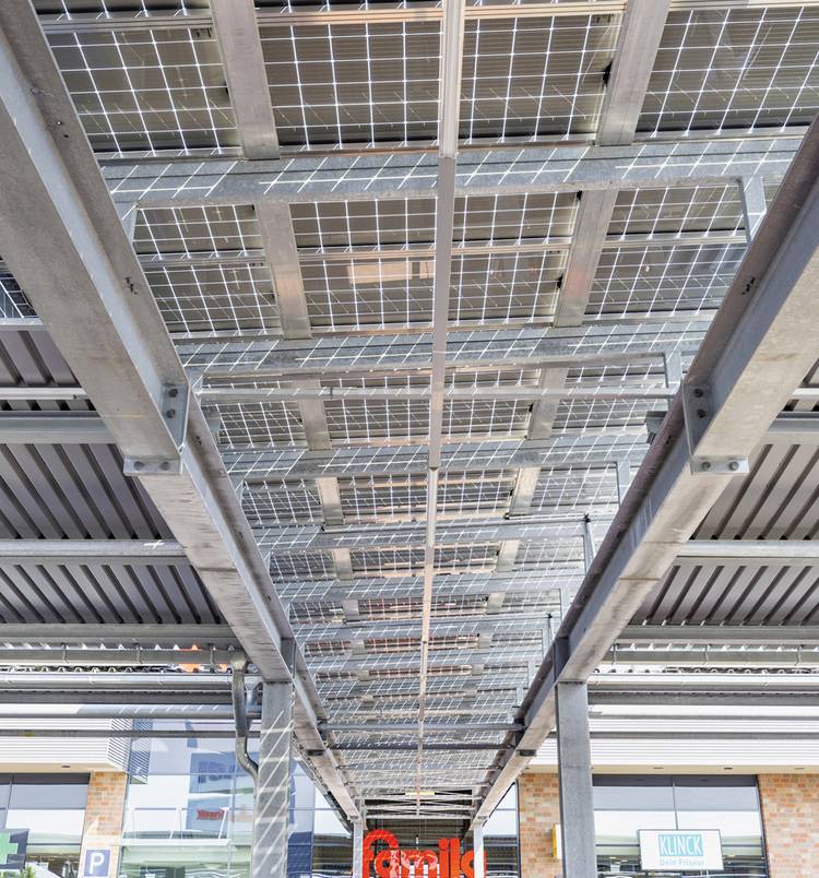 Doch für die Fußgängerwege zu den beiden Eingängen des Supermarktes haben die Planer einen Sonnenlichttunnel geschaffen. Denn diese haben sie mit semitransparenten Modulen überdacht, die direkt in einer Unterkonstruktion von Clickcon integriert sind. Um hier ohne weitere Sicherungsmaßnahmen auszukommen, die für Überkopfverglasungen notwendig sind, wenn sich darunter Menschen aufhalten, musste ein Modultyp her, der eine entsprechende bauaufsichtliche Zulassung mitbringt.