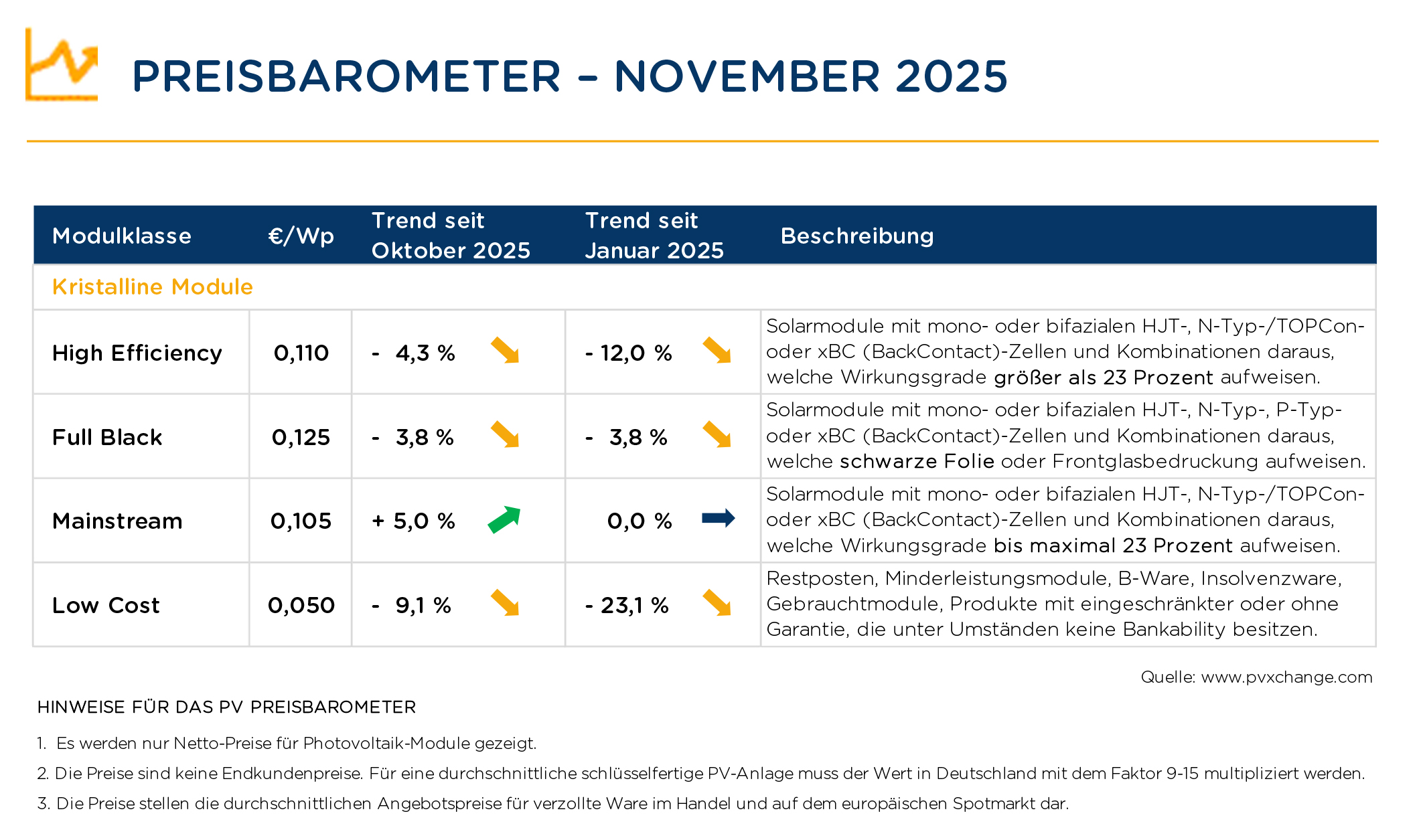 Tabelle mit Preisen für Solarmodule nach Typ im November 2025, Preisentwicklung der Vormonate und Kurzinfos für Entscheider in der Gebäudetechnik.