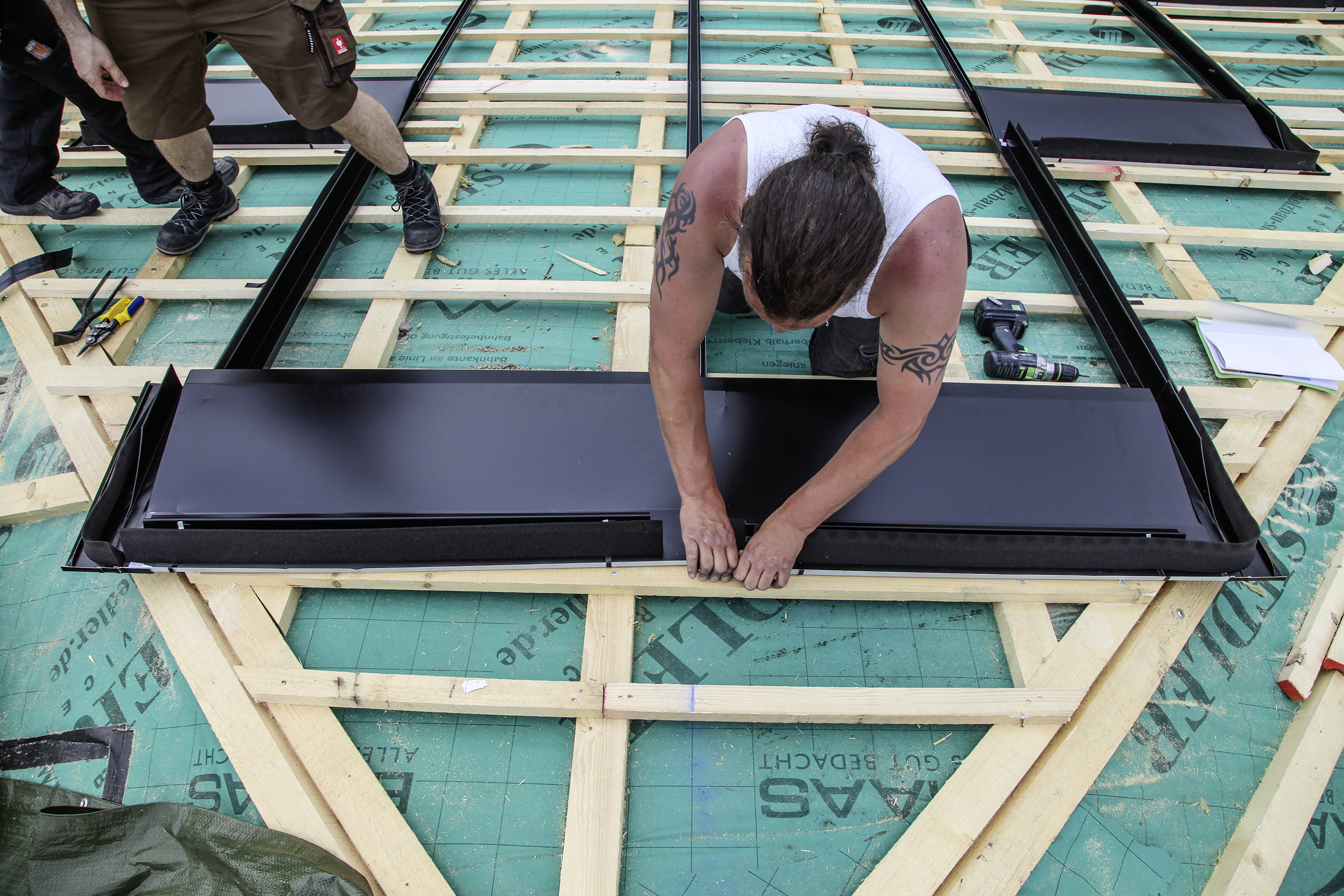 Anschließend erfolgte die Montage der firstseitigen Eindeckbleche von links nach rechts. In den fertiggestellten Eindeckrahmen wurden die Photovoltaikmodule eingelegt. Dabei erfolgt die Verlegung von oben nach unten.