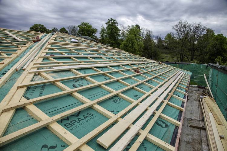 So kann Feuchtigkeit nach außen diffundieren. Die Funktion der Wärmedämmung wird geschützt und eine dauerhaft trockene Dachkonstruktion ermöglicht. Die Lagesicherung erfolgt mit Konterlatten auf den Sparren.