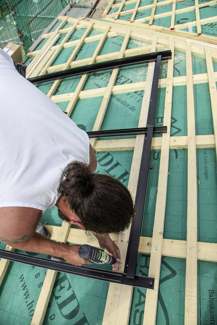 Die Montage des Eindeckrahmens erfolgt bei diesem System vor der Modulmontage von unten nach oben. Das macht es möglich, dass nach der Modulmontage das umliegende Dach nicht mehr begangen werden muss.